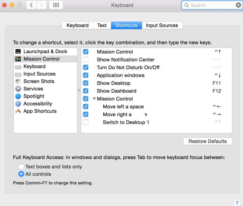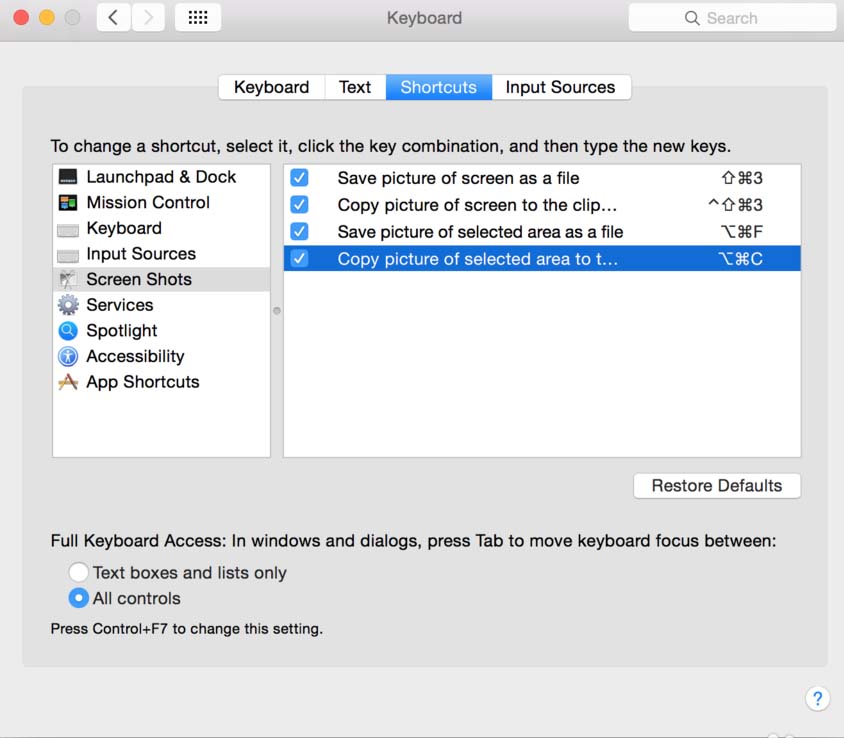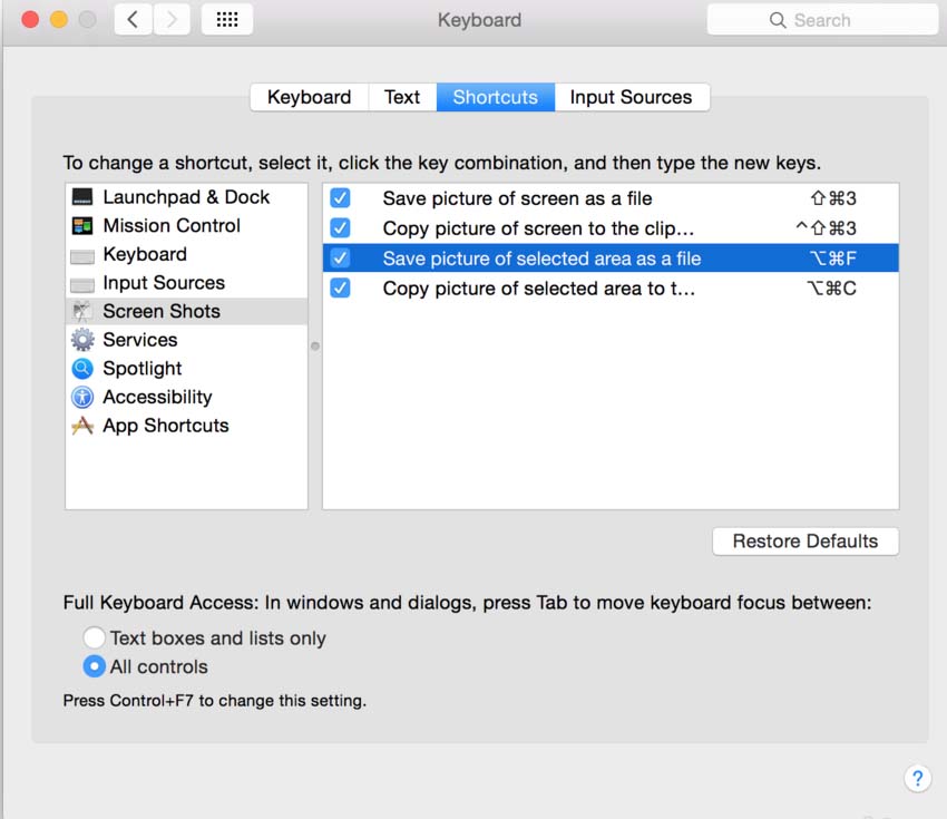 6、如圖選中的快捷鍵功能項,就是截圖快捷鍵。comand+alt+f和command+alt+c。我把系統默認的+4改成了+f,把+3,改成了+c。這樣更容易記憶。這也說明系統默認的快捷鍵我們是可以修改的。不是一成不變的。