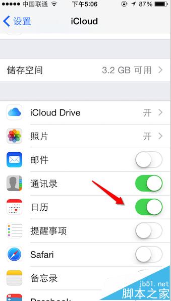 1、、iPhone的iCloud的設置在系統的“設置”里面,同樣確保“日歷”選項是開啟的。