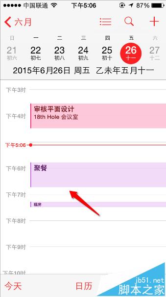 4、不到1分鐘我們就可以查看一下自己iPhone手機的“日歷”app,就能看到,“聚餐”這一個在Mac上新增的事件已經自動同步到我們的iPhone上來了。