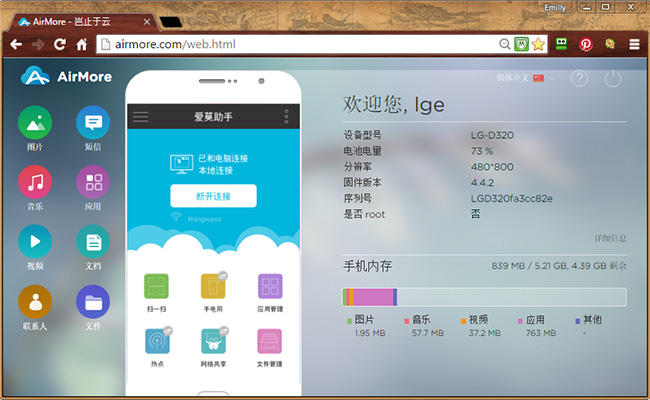 作為一個跨平臺、支持多系統的應用,AirMore絕對是將LG連接至Mac電腦的最好方法之一。到目前為止,很多應用只能支持Windows系統,而AirMore可以同時兼容Windows和Mac兩大系統。只要你在電腦上安裝了谷歌、火狐或者Safari瀏覽器,你會發現在電腦上管理你的手機真的是小事一樁!
