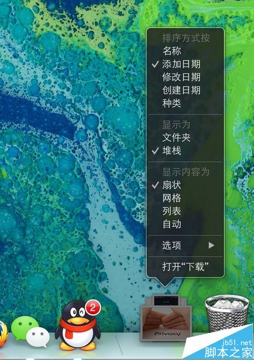 4、接下來(lái)請(qǐng)用鼠標(biāo)右鍵點(diǎn)擊“下載”欄目,并調(diào)整它的顯示方式:排序方式為:添加日期,即從下到上,顯示最新的下載項(xiàng)目,顯示為:堆棧,顯示內(nèi)容為:扇狀,如圖所示