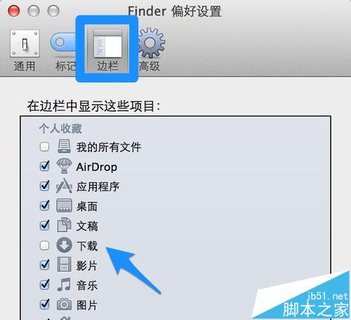 2、接下來(lái)在 Finder 的偏好設(shè)置中,先點(diǎn)擊“邊欄”欄目,再選擇列表中的“下載”選項(xiàng),如圖所示