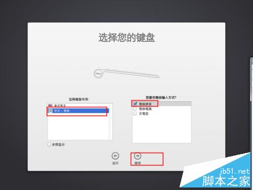 1)選擇鍵盤布局處選擇中文-簡體,在您喜歡哪些輸入方式?選擇簡體拼音,接著點擊繼續按鈕