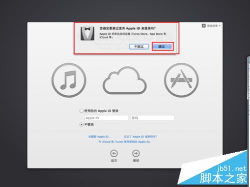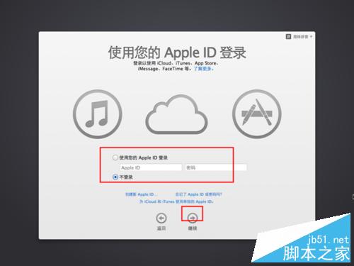 5、接著在使用您的Apple ID登錄頁面可以進行ID登錄,若沒有ID可自行注冊或者選擇不登錄。接著點擊繼續按鈕
