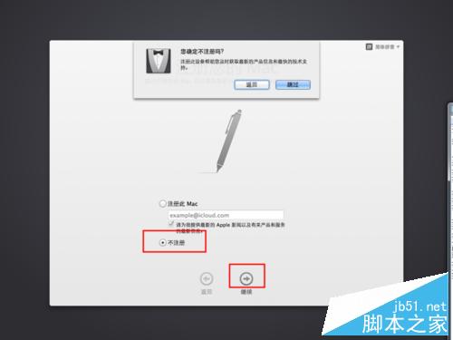 10、接著點擊選擇不注冊,以及繼續按鈕,在彈窗選擇跳過。