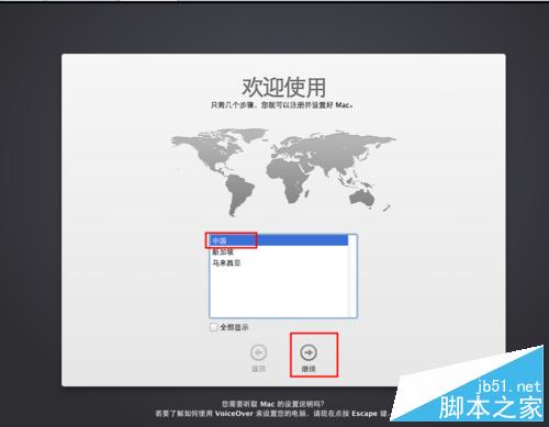 2、點擊選擇中國接著點擊右向繼續按鈕