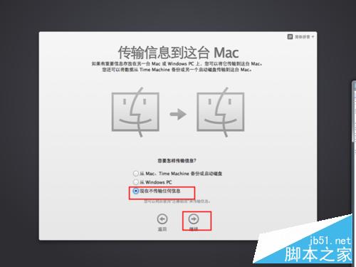 4、接著在傳輸信息到這臺Mac頁面選擇現在不傳輸任何信息,此頁面若有個人需求也可以選擇其他方式進行文件信息轉移,接著點擊繼續