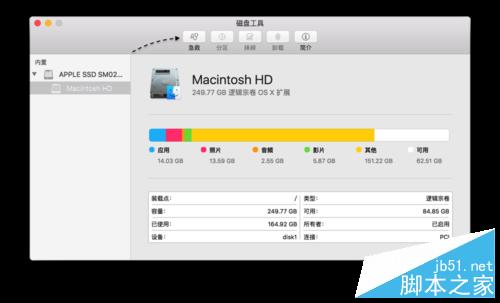 3、在磁盤工具中,在左側(cè)窗口中選擇好想要修復(fù)的磁盤,然后再點(diǎn)擊頂部的【急救】按鈕,如圖所示