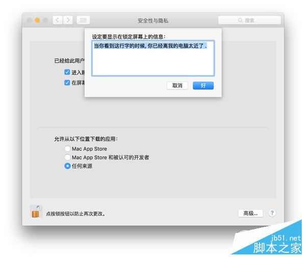 在系統偏好設置 - 安全性與隱私中, 在屏幕鎖定時顯示信息, 點擊設定鎖定的信息。