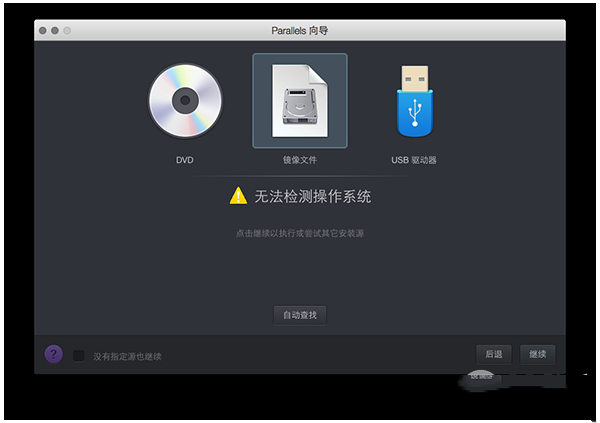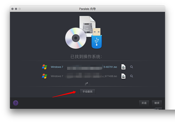 4、點擊“手動查找”按鈕,然后將win10的iso鏡像文件拖動到parallels窗體中。它有可能無法識別win10,沒關系,點擊“繼續”按鈕。