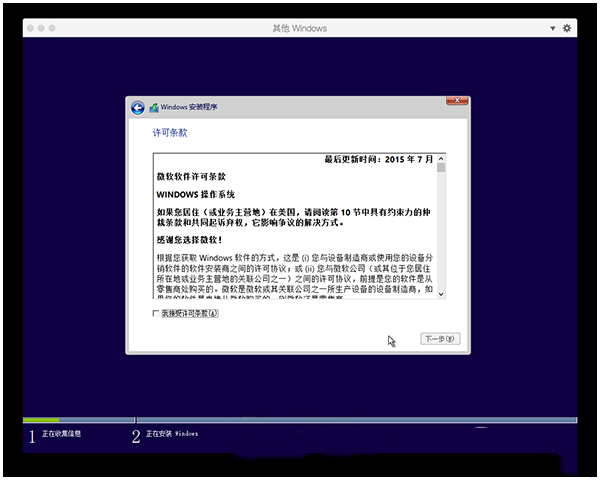 7、安裝方法與實體機及其他虛擬機安裝方式相同,基本上是下一步、下一步地點擊。接受許可條款,然后點擊“下一步”按鈕,接下來按照提示安裝即可。