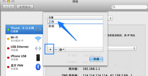 4、在彈出的位置編輯窗口中,點擊右下方的“+”按鈕,隨后會新建一個位置的網絡配置文件。我這里把它更改為“工作”,好了以后點擊“完成”按鈕,如圖所示