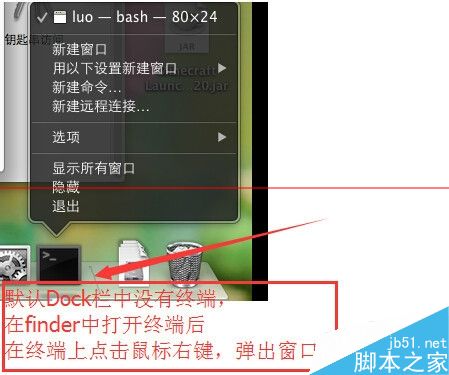 NO,這個系統沒有打開終端的快捷鍵。我們只有通過第二種方法打開終端之后。終端會顯示在dock欄中。那么我們在此時臨時出現在dock欄中的終端點擊鼠標右鍵。