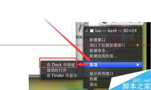 把鼠標移動到新彈出的菜單,移動到里面的【選項】---->點擊【在Dock】欄中保留。這樣就可以把終端永久的放在dock欄上啦哦!
