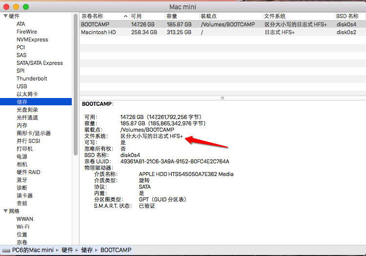 第三步、在Mac界面,點擊左側(cè)“儲存”,在右側(cè)窗口,找到“文件系統(tǒng)”,您就可以看到Mac硬盤格式了。