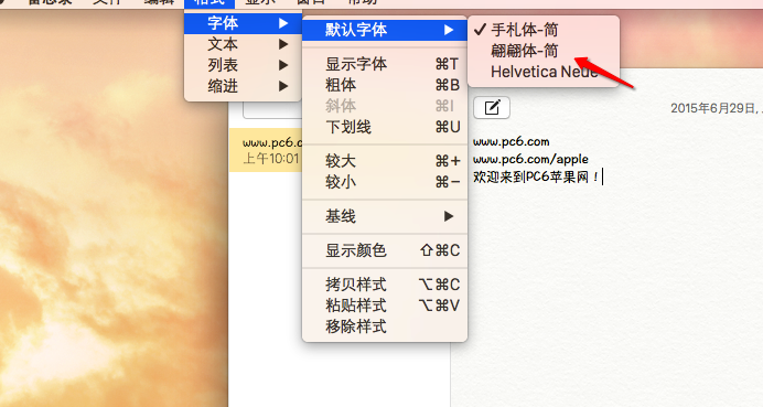 Mac備忘錄可以和iPhone以及iPad進(jìn)行無縫的對接和自動(dòng)同步,是Mac平臺(tái)上一款非常實(shí)用的簡單備忘工具,對于很多年輕的Mac用戶來說,并不太喜歡規(guī)矩的文字,其實(shí)Mac中的備忘錄也是可以更換字體的,下面PC6小編就教大家如何更換Mac備忘錄的默認(rèn)字體。