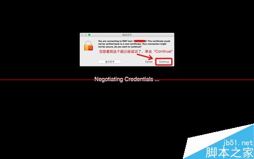8、當(dāng)您雙擊列表開始連接后,正常就會看到這個提示框了,單擊“Continue”繼續(xù)就可以了。