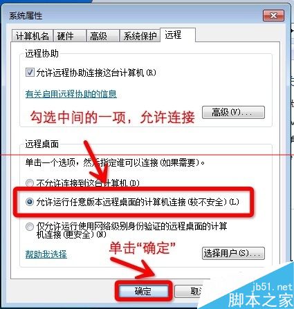 3、按照圖片上得步奏,勾選“允許運行任意版本遠(yuǎn)程桌面的計算機連接(較不安全)”,選擇后單擊“確定”即可完成Windows電腦端的所有設(shè)置了。下一步我們進入Mac 運行“Microsoft Remote Desktop”軟件。