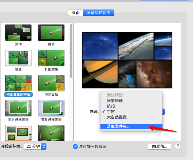 4、Mac的屏幕保護程序同樣是可以選擇演示內容的來源的,在上圖的“來源”中,我們可以挑選自己喜歡的圖片來進行屏保演示。