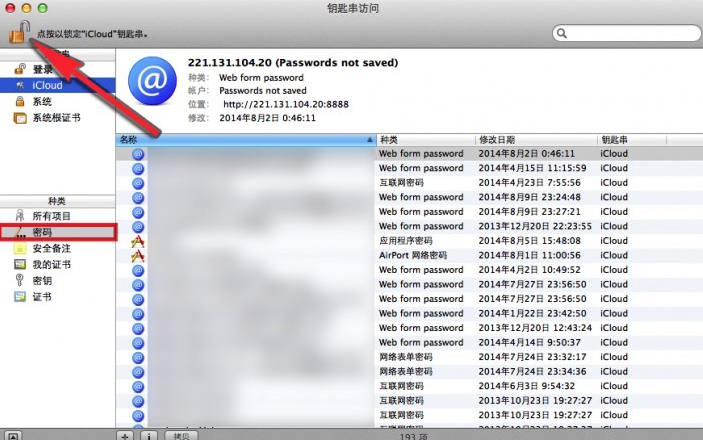 第二步:在“鑰匙串訪問”應用程序窗口左側欄點選擇“密碼”種類。然后點擊左上角的鎖狀圖標,輸入你的密碼解鎖。