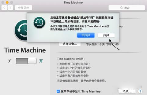 6、要使用移動硬盤來作 Time Machine 備份的話,系統會刪除上硬盤上的所有數據。點擊“抹掉”按鈕繼續。