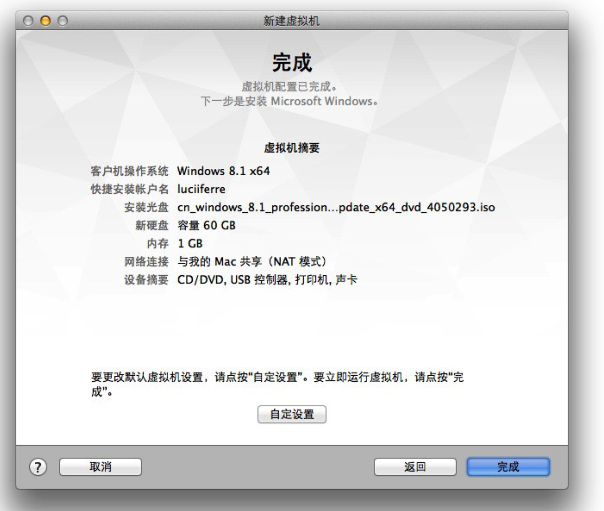 6、當虛擬機配置完成后,VMware Fusion 7 會給出總結,包括客戶機操作系統、賬戶名、內存等信息,如果確認無誤可以點擊完成并開始 Windows 8.1 虛擬機安裝。VMware Fusion 7 的 Windows 系統安裝也不需要任何操作,完成上面的配置后,VMware Fusion 會自動開始安裝。我們只需要等待即可。