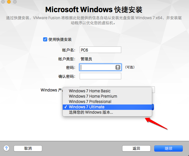 4、載入 Windows 安裝文件后,可以選擇快捷安裝,唯一需要輸入的就是賬戶名。密碼以及 Windows 產品密匙都可以選擇不填。選擇要安裝的Windows版本,確定好用戶名后點擊繼續。