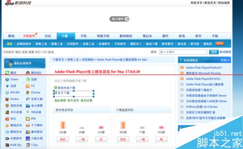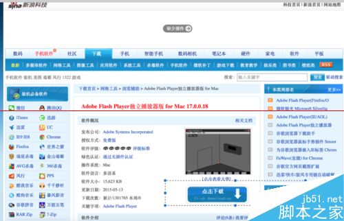 1、下載相應的flash player可用版本:通過baidu 搜索flash player for mac,找到新浪科技,按照圖示框框選中項一步步直到安裝文件下載完成;