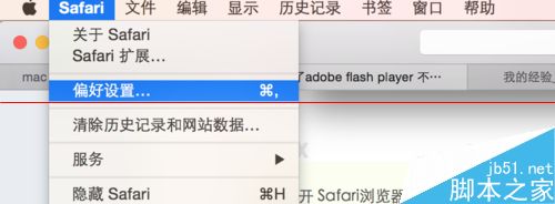5、安裝完成后設置網頁瀏覽器可以加載flash player,打開safari,從左上角單擊Safari選擇偏好設置