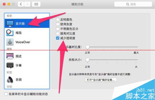 三:來到“輔助功能”里的顯示器功能設置中,找到右邊的“減少透明度”,勾選以后就不透明了,當你關閉透明度以后,很有可能就把你的Mac減輕了一些工作量,讓你的Mac更加的輕松一些