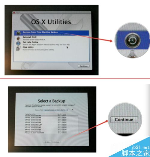 選擇您硬盤內最近的備份,點擊繼續,Mac 將會自動恢復 Time Machine 備份,操作成功后 Mac 將會重啟。