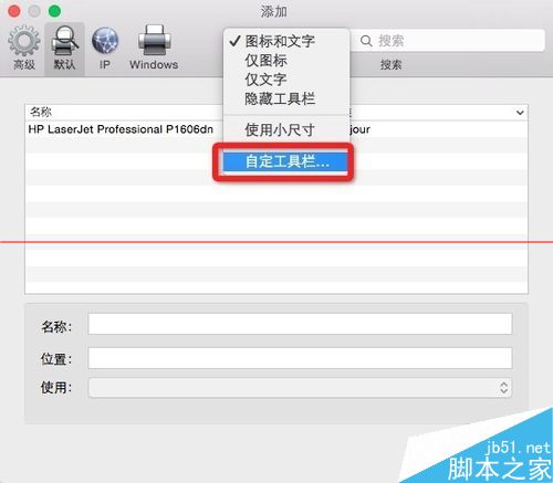 1、HP LaserJet P1008 在OS X 驅動列表里,是可以安裝,但是總是打印一半而失敗,不得其解,把步驟分享下,望指導。按住mac鍵盤的command鍵,右鍵添加打印機的界面的菜單的空白處,點擊【自定義工具欄】,將【高級】拖入工具欄。
