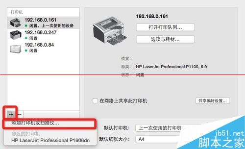 3、點擊打印機列表下面的 【+】,再點擊【添加打印機或掃描儀】。相應的,選中已經添加的打印機,再點擊【-】即可刪除該打印機。