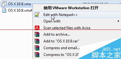 2、右擊.vmx文件(名字也是自己設置的,我這個設置是OS X 10.9.vmx),使用記事本(或者Notepad++都是一樣的)打開文件。
