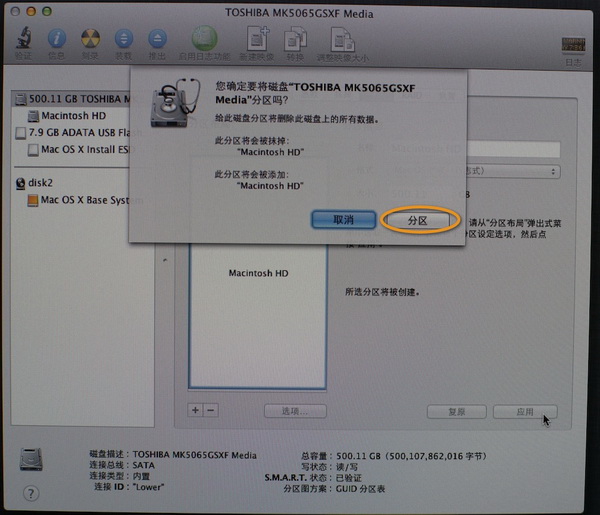 選擇需要安裝系統的硬盤,默認選擇第一塊硬盤,單擊“分區”,分區布局推薦選擇“1個分區”,名稱無所謂,格式選擇“Mac OS 擴展(日志式)”,單擊“應用”。