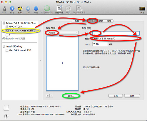 插入U盤(至少8G容量)。單擊U盤名稱,選擇“分區”,在分區布局選項中選擇“1個分區”,名稱建議使用數字“1”,格式選擇“Mac OS 擴展(日志式)”,之后進入“選項”。