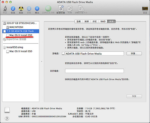 U盤格式化完成后選擇“恢復”選項。將剛才格式化好的U盤“1”拖拽到目的磁盤右邊的欄目中,在將“Mac OS X Install ESD”拖拽到源磁盤右邊的欄目中,單擊“恢復”。
