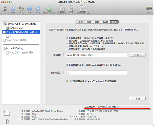 啟動U盤制作完成后U盤的盤符由原來的“1”變成了“Mac OS X Install ESD”了。下面就可以利用此U盤啟動并安裝Lion系統了.