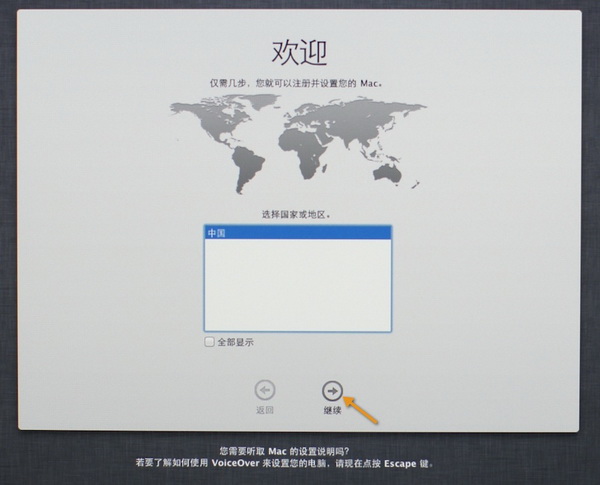 系統安裝完成后會自動重啟。系統啟動后就看到了“歡迎”界面。之后的操作就和剛買來新的Mac一樣設置即可。