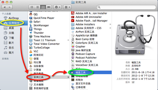 啟動Finder,進入“應用程序” - “實用工具” - 雙擊“磁盤工具”。