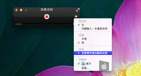 直接進入正題,啟動 QuickTime Player,點擊菜單欄中的文件——新建屏幕錄制,如果想要在錄制的過程中對鼠標點擊的位置突出的話,可以勾選控制界面右邊的倒三角,勾選“在錄制中顯示鼠標點按”,當然你還可以在這里設置麥克風輸入,比如錄制教程的時候,一邊講解一邊錄制,那么就可以把“內建輸入:外置麥克風”勾上,還可以設置視頻錄制的質量等等。