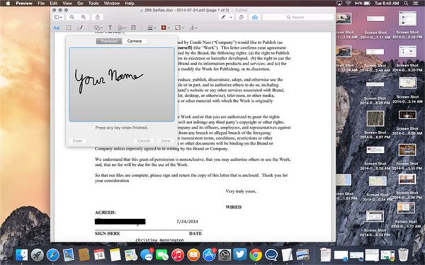 收起掃描儀、傳真機、紙和筆,你可以使用觸摸板留下簽名。選擇工具>注釋>簽名>管理簽名。你可以使用觸摸板來獲得簽名,或者使用Mac的iSight相機拍下現有文檔中的簽名。以后,當點擊“Sign”按鈕,或者選擇工具菜單里的簽名時,你可以把簽名粘貼到PDF中。