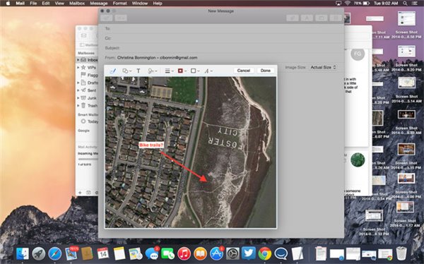 如果有人發給你一張照片或一個文檔,你想做些筆記,有了Yosemite,你不需要一個單獨的照片編輯器,可以使用“郵件標記”功能。如果有人發送了一個附件,單擊圖像右上角的下拉箭頭,選擇“標記”。然后,可以插入正方形、圓圈和箭頭等形狀,添加簽名或者輸入一些文字。然后你可以將文件并發回給收件人,甚至不用離開郵件應用。