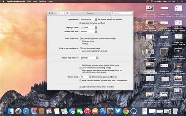 Yosemite提供了包括文字大小、顯示屏對比度以及其他視圖等多種選擇。Yosemite提供了許多可以調整的設置,不管是屏幕的顯示方式,或是視覺或聽覺上調整,還能調節菜單欄的透明度、顯示屏的對比度、文本的大小和光標的大小。