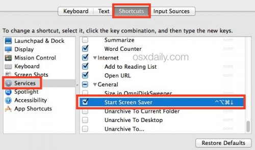 4、找到我們新創(chuàng)建的服務(wù) Start Screen Saver, 點(diǎn)擊 add shortcut按鈕去設(shè)置一個(gè)快捷鍵,本例子中我們使用 Control + Command + Option + Down 來(lái)啟動(dòng)屏保,當(dāng)然這個(gè)對(duì)于你來(lái)說(shuō)可以自由選擇。