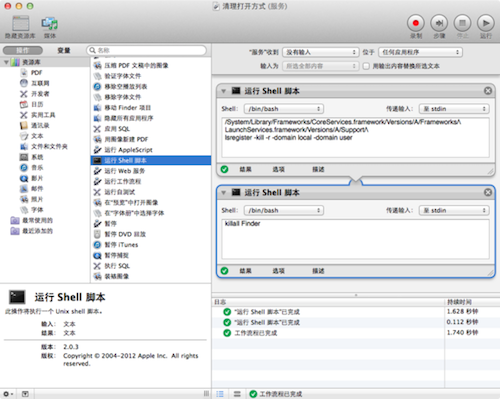 首先打開系統里的 「Automator」 ,新建一個服務,然后將兩個 shell 腳本拖到流程圖里并輸入代碼。