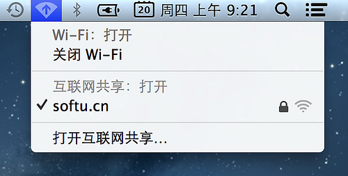 當將Mac作為Wi-Fi熱點時,菜單欄上的Wi-Fi圖標會變成一個向上的箭頭,表示開啟Wi-Fi共享,點擊即可查看Wi-Fi熱點的名稱和打開互聯(lián)網(wǎng)共享等。