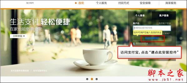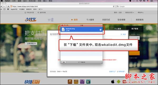 1、以Safari瀏覽器為例:打開支付寶首頁www.alipay.com,點擊【請點此安裝控件】;