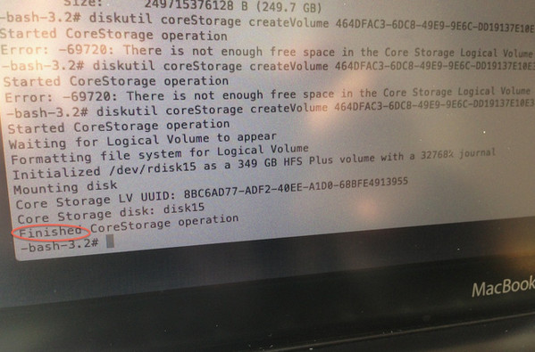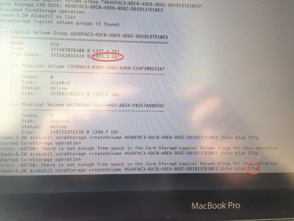 輸入》 diskutil coreStorage createVolume 【BBC6AD77-ADF2-40EE-A1D0-68BFE4913966】 jhfs+ blub 375g