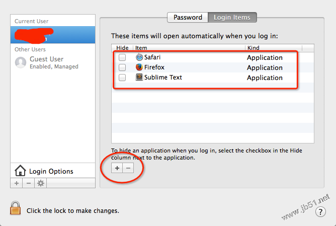 可以看到有safari、firefox、sublime text是默認(rèn)開機(jī)啟動的,點(diǎn)擊左下角的“+-” 即可添加或刪除開機(jī)啟動程序。